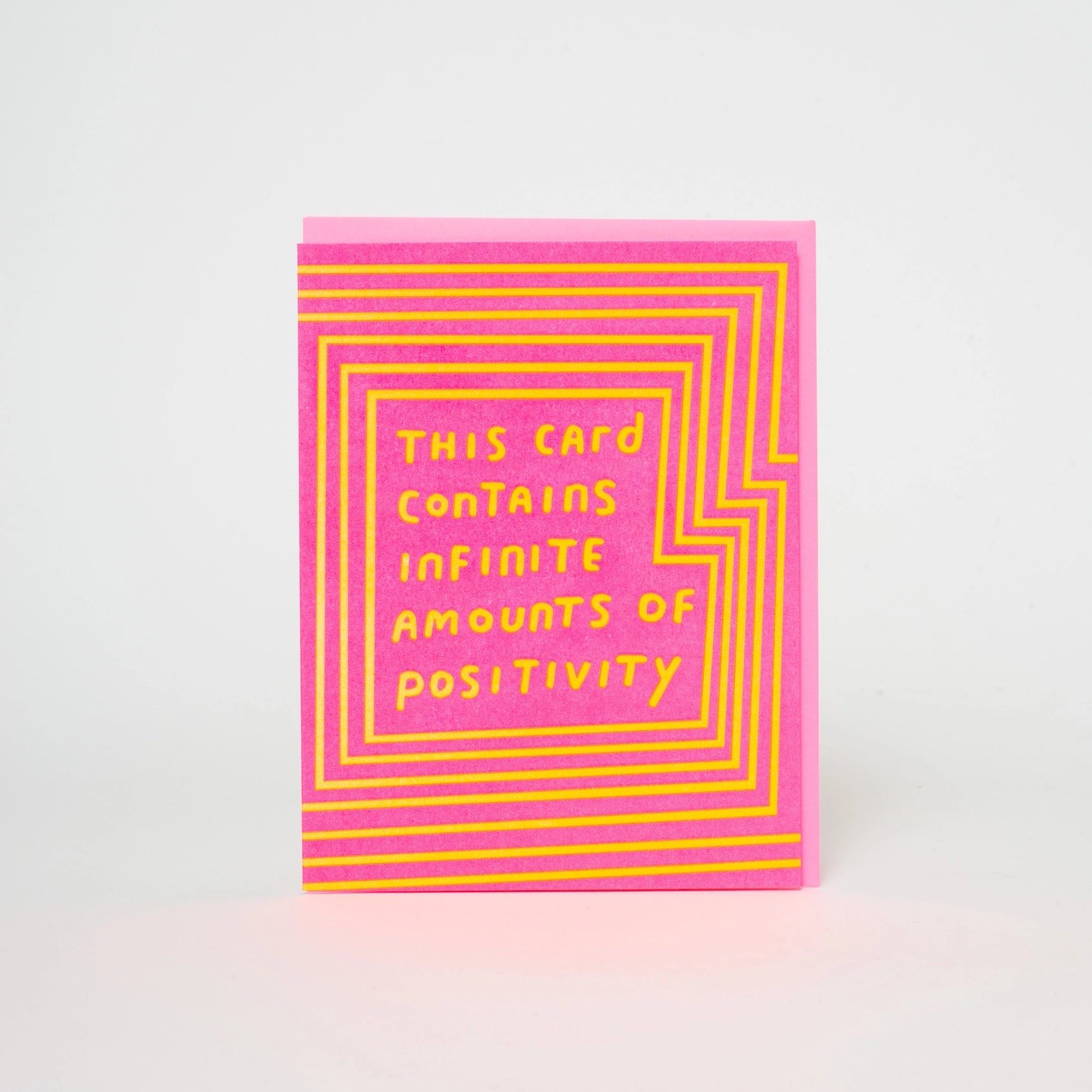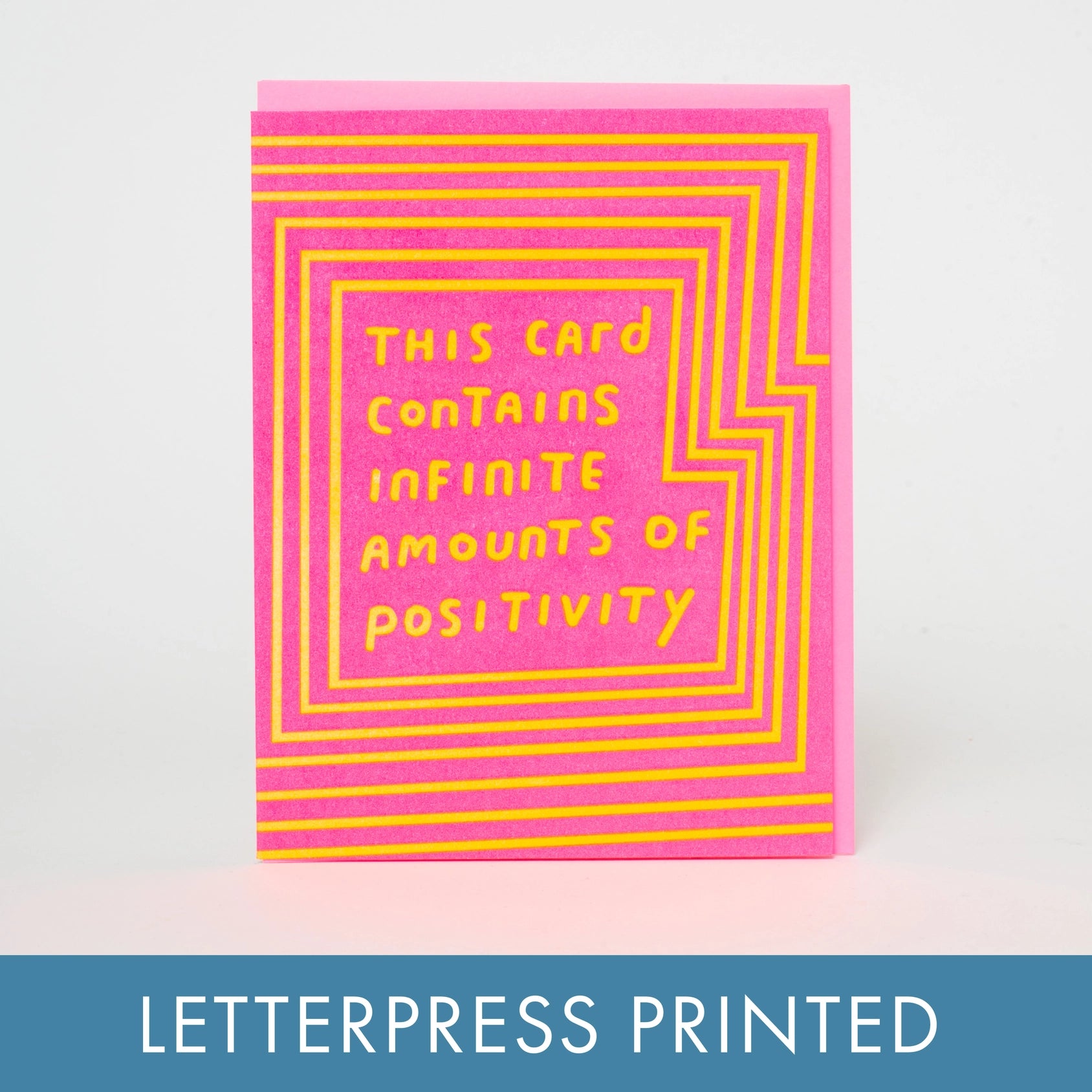 Send a burst of encouragement with our Infinite Positivity Letterpress Greeting Card, featuring bold neon pink and yellow artwork and the uplifting message: “This card contains infinite amounts of positivity.” Letterpress printed for rich texture and vibrant impact, it’s the perfect pick-me-up for anyone who could use a little extra light, whether they’re celebrating, struggling, or simply needing a smile. Bright, energetic, and impossible to ignore, this card delivers good vibes in the most joyful way. Comes with a coordinating envelope.